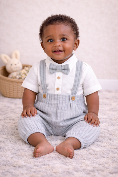 Dress your little one in timeless charm with this Classic Linen Suspender Romper Set. This adorable outfit features a crisp white short-sleeve shirt paired with soft beige plaid suspenders and a matching romper bottom. The coordinating bow tie adds the perfect touch of sophistication for special occasions, photoshoots, or celebrations.