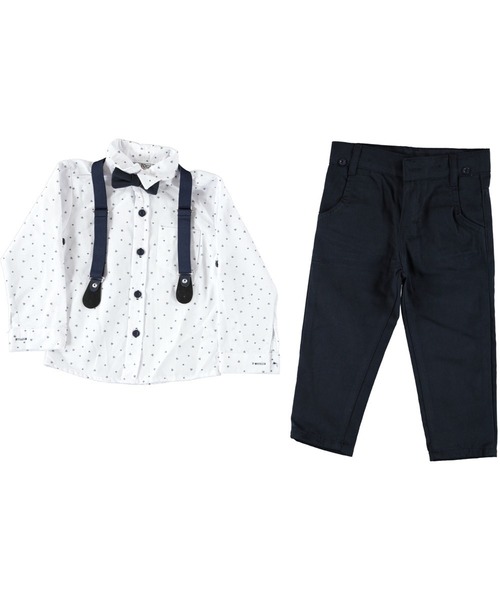 The crisp white button-down shirt features a subtle navy print, adding just the right amount of detail. Attached navy suspenders and a matching bow tie complete the dapper look—effortlessly stylish and irresistibly cute.