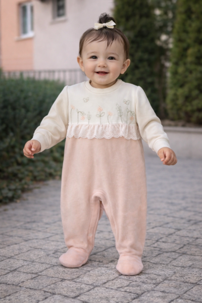 The scalloped lace trim adds a vintage-inspired touch, while the long sleeves and enclosed feet keep baby warm and cozy. Crafted from ultra-soft, breathable fabric, this piece is perfect for both daywear and peaceful sleep.